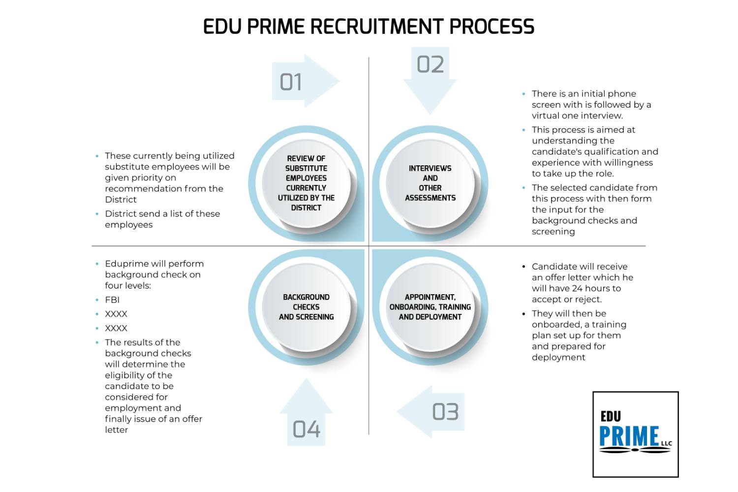 At EDU PRIME LLC, We have perfected the hiring process, by spreading out the recruitment process throughout the year, building a substitute personnel database that meets individual client needs.